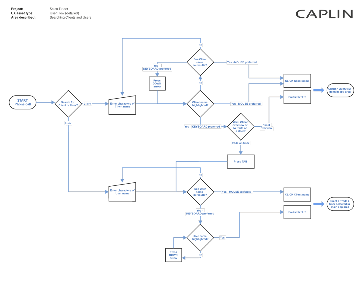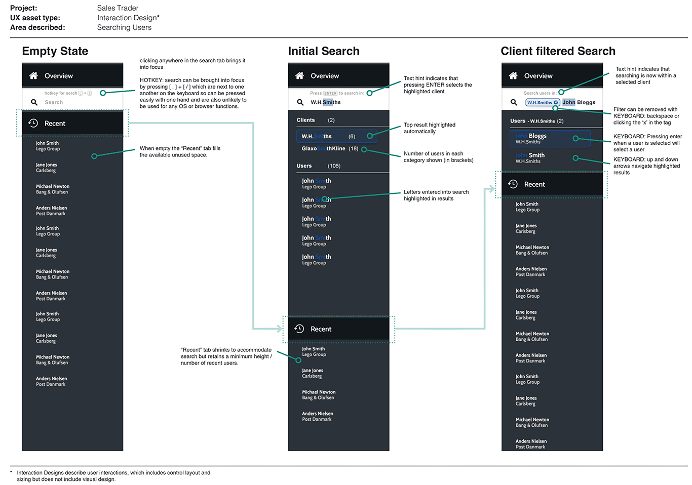 After researching traditional search UI patterns and some modern examples I drew an interaction model for using a keyboard and/or a mouse to navigate through two levels of search in one UI space.