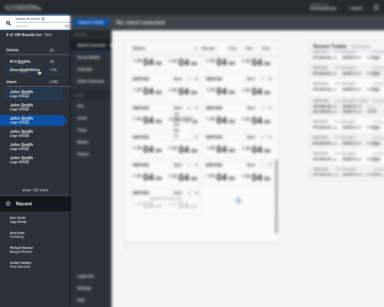 The trader types in a term and can select a result if it appears with keyboard or mouse. If not then they can add more characters or focus a Firm (tier 1) and press 'Tab' to apply a filter to further search terms down to that Firm.